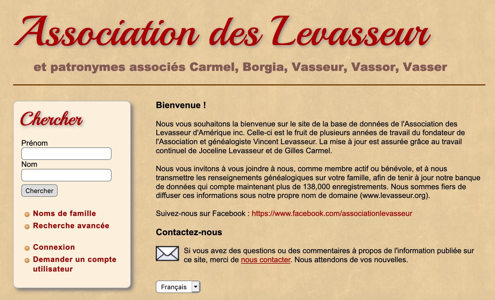 Our members in good standing can also access a second website, dedicated to the distribution of genealogical databases, obitus records, photo albums and many other additional information. Members can access it by clicking on this link: www.levasseur.org/tng. For any information on the association, its activities, contact us.