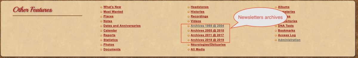 Previous editions (since 1988), including more recent ones, are available to members only; members in good standing may access these editions in the members-only section. Hundreds of articles on the Levasseur family genealogy and history can be found in the members-only section. Follow this link to access the archives of the Levasseur newsletters.